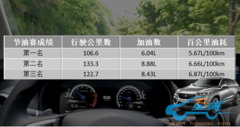 26日一早,WEY VV7车队一行13辆车,从起点加油站加满油箱至跳枪,油表及里程数清零后,同时启程出发。16公里天府大道,74公里高速路,再经过32公里乡村路和盘山路,,在终点加油站启封并加满油,记录里程数、表显油耗、加油量,最终计算出百公里油耗。测试结果显示:挑战赛第一名的好成绩竟然低至5.67L/百公里,第二名为6.66L/百公里,第三名为6.87L/100km。13辆车的平均成绩为8.05L/百公里。