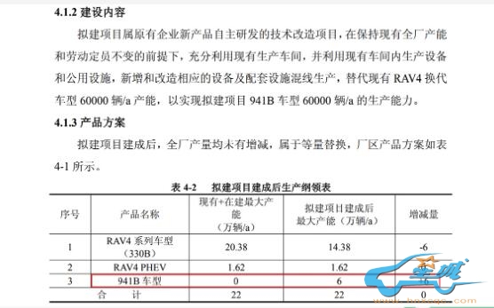 据了解,941B车型导入技术改造项目总投资为262,834.56万元,计划在利用现有车间生产设备和公共设施,新增和改造相应设备及配套设施混线生产,代替现有RAV4换代车型的6万辆/年产能,从而实现941B车型6万辆/年的生产能力。