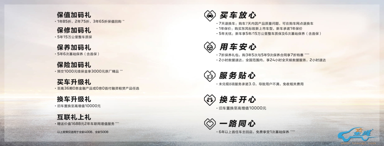 全新4008/全新5008订单火爆原因的背后是东风标致高品质的产品以及诚意满满的服务。其中不得不提的就是东风标致为加速实现品牌全价值链转变,围绕“以客户为中心”的理念,在行业开创性的“五心守护行动”服务承诺基础上再度扩容,针对全新4008/全新5008推出开创行业新标杆的“保值、保修、保养、保险”的“四保”政策,全方位陪伴客户用车全生命周期。