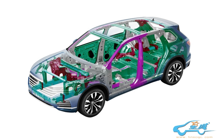 在发动机舱盖板、前后车门板及侧围板等部位,途锐则使用了铝质板材,占车身选材的30%,在保证整车轻量化的同时,还与采用了挤压铝型材的防撞梁、吸能盒等车身部位一起,承担了正面碰撞发生时吸收和弱化碰撞能量的功能,有效确保座舱内驾乘人员的安全。此外,前后减震器支座等处使用了铝铸件材料,15%的使用比例进一步降低了车身重量。尽管与前代车型相比,第三代途锐的车身长度和宽度都有所增加,但更为科学的混合式车身结构使整车重量减轻了106公斤,进一步提高了车辆的燃油经济性。