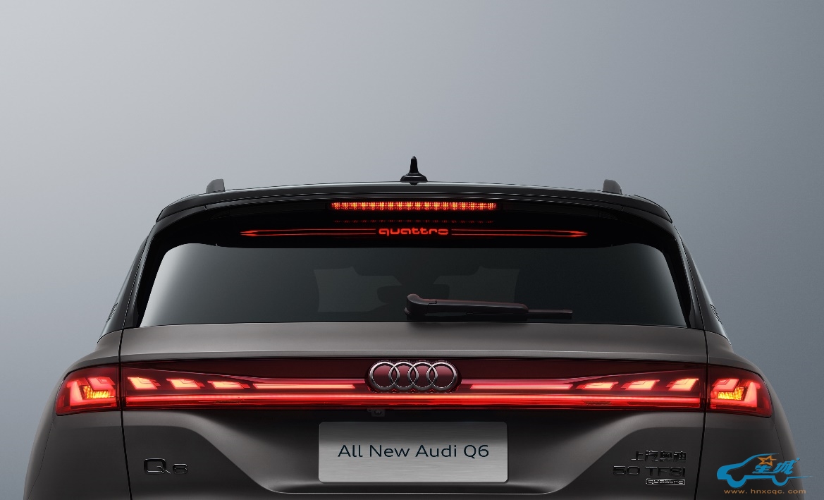 此外,奥迪Q6应用了奥迪最先进的灯光技术。前贯穿式LED灯是首次在奥迪车型上使用,承接两侧智能矩阵式LED大灯,明眸闪耀。车辆尾部藏身着奥迪Q6独具一格的魅力,后尾翼quattro投影式刹车灯将“quattro”字样的红色光影悬浮于后尾窗上,形成更富个性特色的高位刹车灯视觉效果。Q6也成为了奥迪全球量产车中首次搭载这一技术的车型。后尾翼quattro投影式刹车灯与贯穿式流光LED尾灯相结合,不仅实现了极高的车身辨识度,更为用户呈现感官充分交融的科技美学体验。