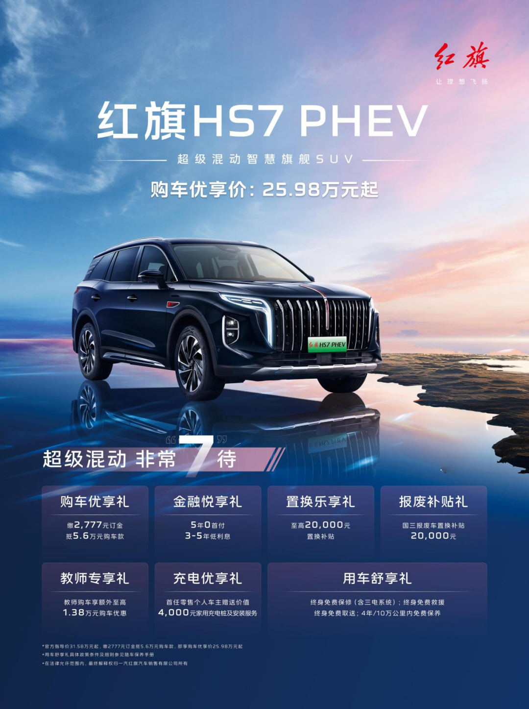 总体来看,不难发现,无论是作为行业标杆的先进混合动力系统,全面的安全保护措施,亦或是丰富的智能化配置与宽敞舒适的内部空间,都让红旗HS7 PHEV在25万价位的混合动力SUV领域中脱颖而出。加之目前红旗HS7 PHEV还能享受2777元订金享25.98万元起的惊喜价购车,此外还可享5年0首付金融礼、置换/报废补贴最高享4万元、三电系统终身免费保养等诸多购车礼遇,这些权益和政策无疑进一步提升了红旗HS7 PHEV的性价比。