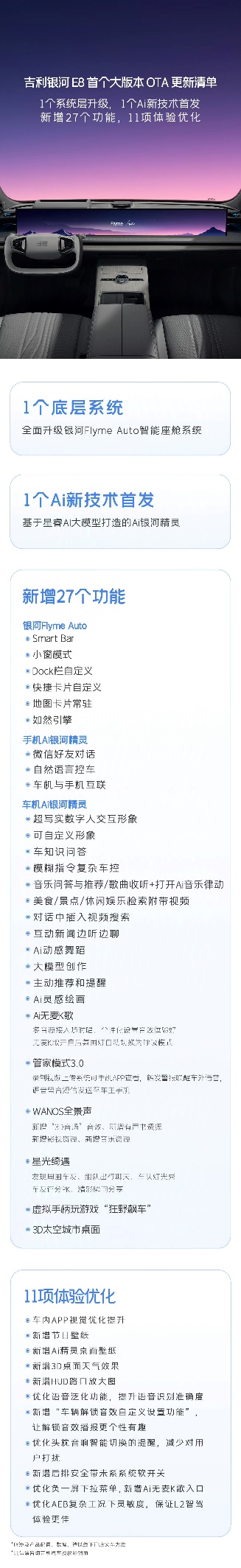 自上市以来,吉利银河E8已累计完成四次OTA更新,新增57项功能并优化了211项用户体验。在9月23日,官方宣布吉利银河E8首次大版本OTA更新,包括一次系统层升级和一个AI新技术首发,同时新增了多达27个功能和11项体验优化。