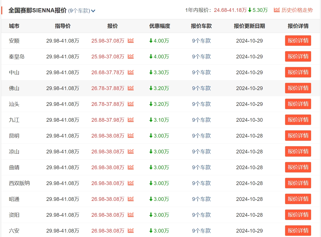 重要的是,如今的赛那早已摒弃了上市初期的加价政策,全系车型均提供了超过2万元的降价优惠。部分城市的优惠幅度甚至高达3万至4万元,这使得赛那的产品力大幅提升。正是这样的价格策略,使得赛那在近几个月内销量激增,一举成为MPV市场的新晋销量冠军。