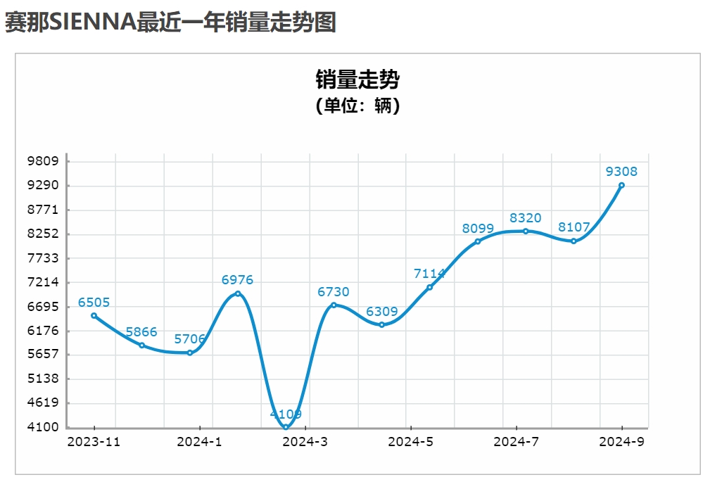 实际上,赛那在9月份的销量激增并非偶然。回顾赛那今年每月的销售数据可以发现,自2024年起,其销量便呈现出稳步上升的趋势,在8月之前已经连续三个月稳定在8000辆以上。因此,当进入传统销售旺季的9月时,单月销量突破9000辆也就不足为奇了。