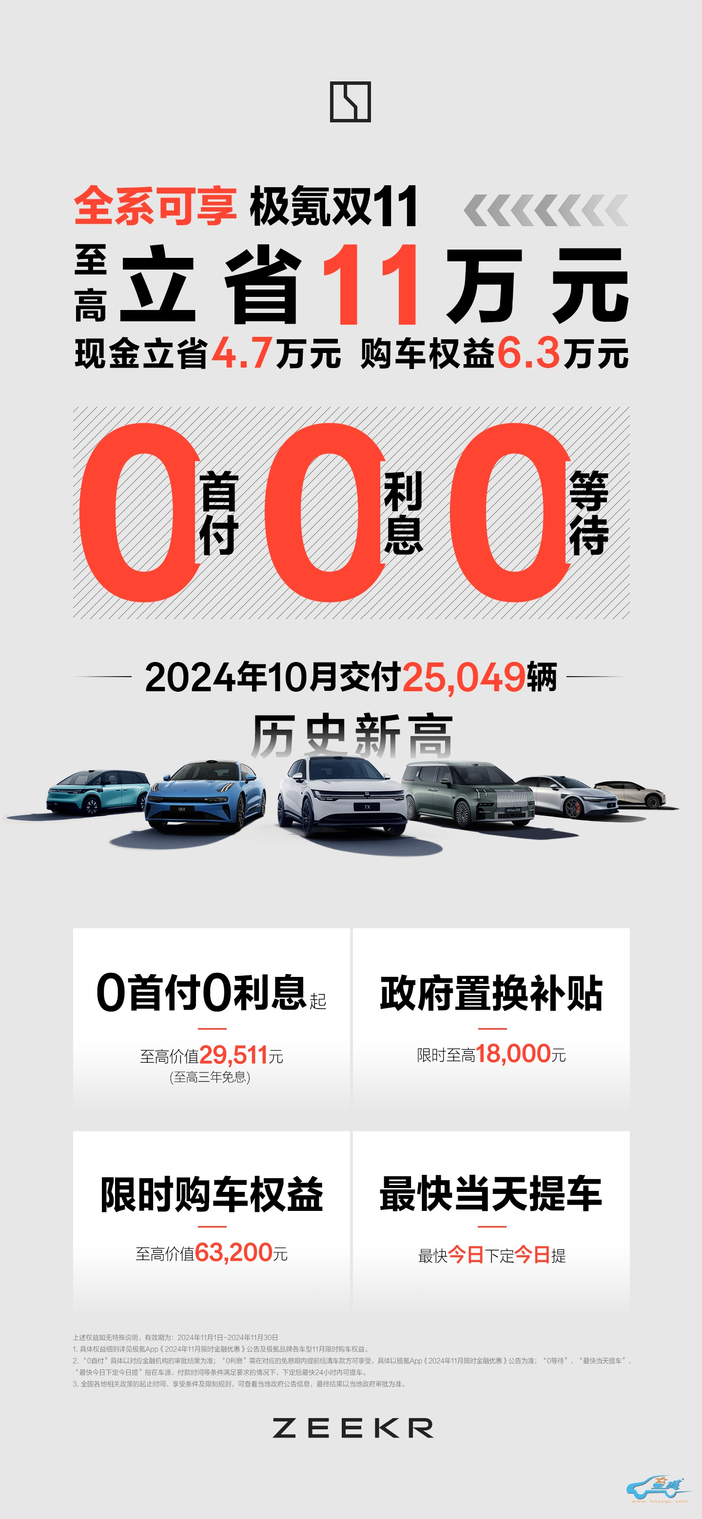 在交付量创造历史新高之际,包括2025款极氪X在内,极氪旗下全系车型推出全年第一次跨车型联合行动,旨在年底各地政府置换补贴进入倒计时的节点,以0首付0利息0等待的限时购车权益,及强大的交付体系,让消费者最快速地体验最好的纯电产品。其中,热门车型极氪001和极氪007均可享3年0利息,极氪7X、极氪009、极氪MIX以及极氪X车型则可享2年0利息,叠加各地政府置换补贴及其他限时购车权益,至高可省11万元。