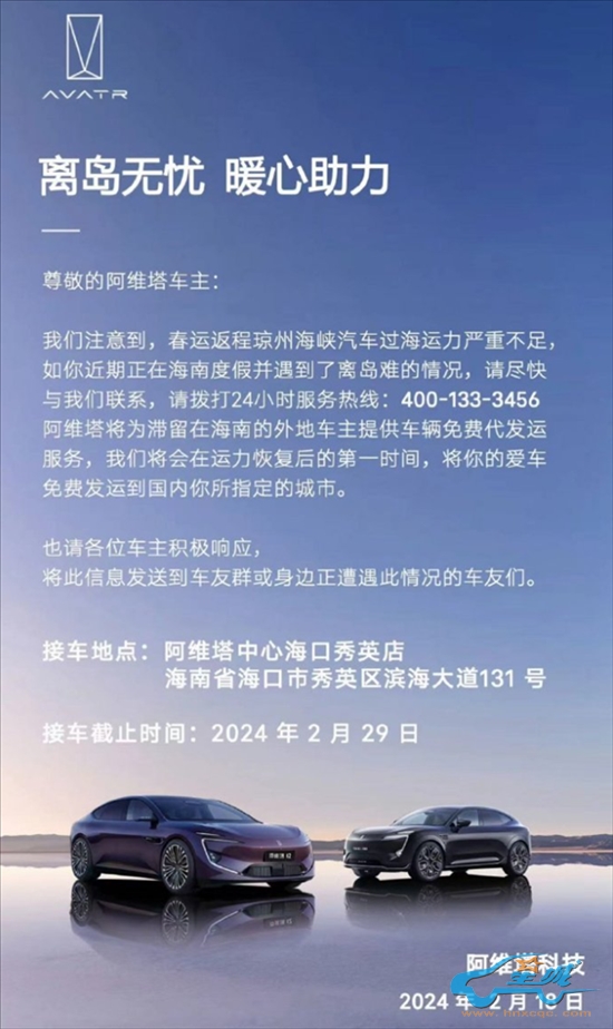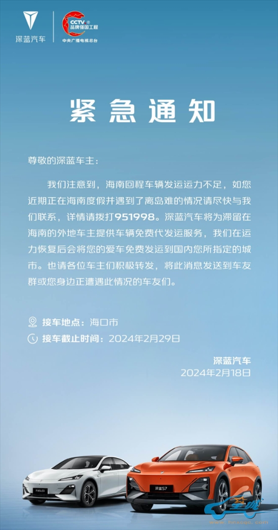 事实上,阿维塔不是唯一一家为“滞留岛内”车主免费提供发运服务的车企,深蓝汽车今日也发布了类似的通知,宣布免费为车主提供代发运服务。