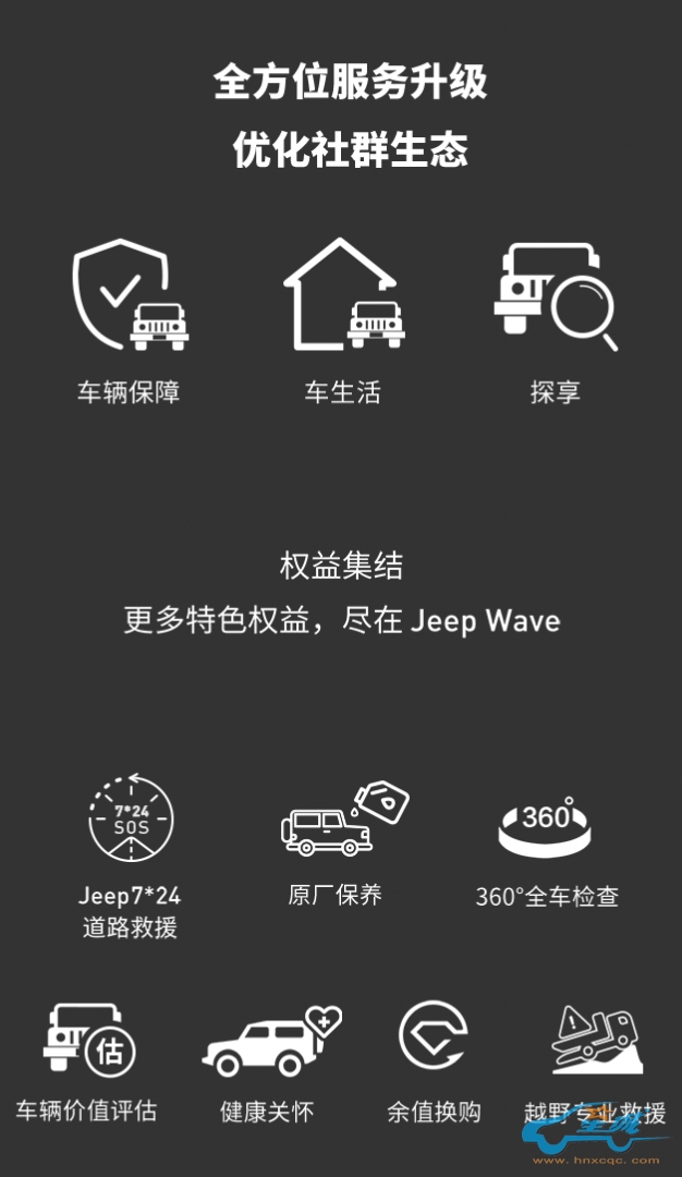 车辆保障:原厂保养;Jeep车辆健康报告;车辆360全面检查;车辆价值评估。
