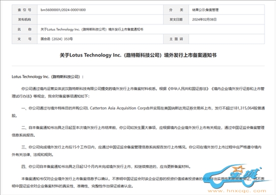 2月19日消息,我们从中国证监会网获悉,吉利子公司路特斯科技(Lotus Technology Inc.)已获得了境外发行上市备案通知书。