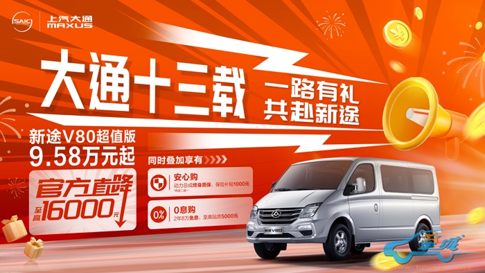 一路有礼,共赴新途!2月28日,“中国轻客第一品牌”上汽大通迎来品牌13年周年庆,由新途 V70、V80、V90、EV70、EV80、EV90等产品组成的“王牌”阵营均吸引诸多车友关注。其中,“高价值宽体轻客”新途 V80超值版更是以“装的多、跑的快、省的多”等多项高性价比优势,赢得广大轻客爱好者的青睐。如今,超值购车优惠政策同步袭来!新途 V80超值版官方直降至高1.6万元,低至9.58万元起;同时,用户可叠加享有动力总成终身质保、保险补贴1000元(两者二选一)的超值安心购;以及2年8万免息,至高贴息5000元的0息购等一系列超值优惠政策。历经13年厚积薄发,此次上汽大通周年庆,是13年来品牌官方最大幅度让利于民,以用户为先,为广大用户献上一场大规模、高质量、多优惠的汽车盛宴。