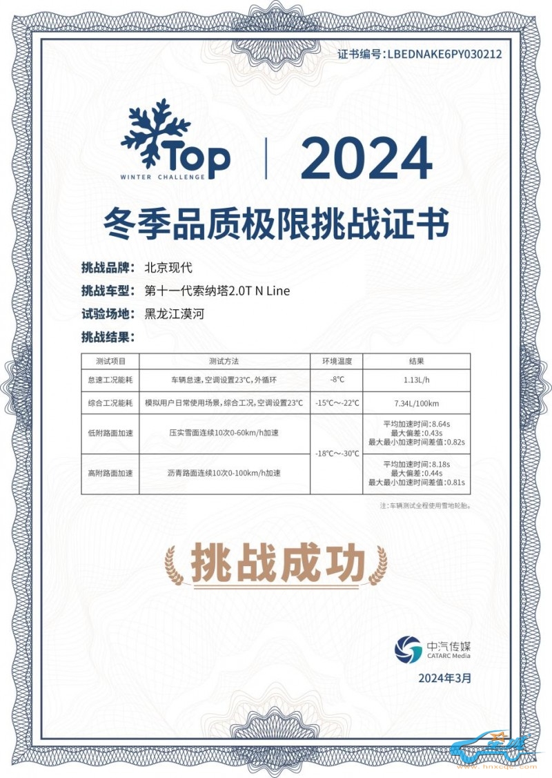 根据中汽研此次的测试数据表示,-8℃的气温条件下,在车辆怠速状态,空调设置23℃,开启空调外循环,第十一代 索纳塔N Line每小时油耗仅为1.13L/h;实际路跑中,在-15°C~-22°C条件下,模拟用户日常使用场景的综合工况,空调设置23°C,第十一代 索纳塔N Line油耗为7.34L/100km,对比标定油耗仅高出0.44L/100km。相比之下根据一份美国数据研究公司Recurant的报告显示,在对18款主流车型进行分析后,发现电动汽车在低温状态下,平均会损失30%的续航里程,而根据消费者真实的体验,该数据只多不少。