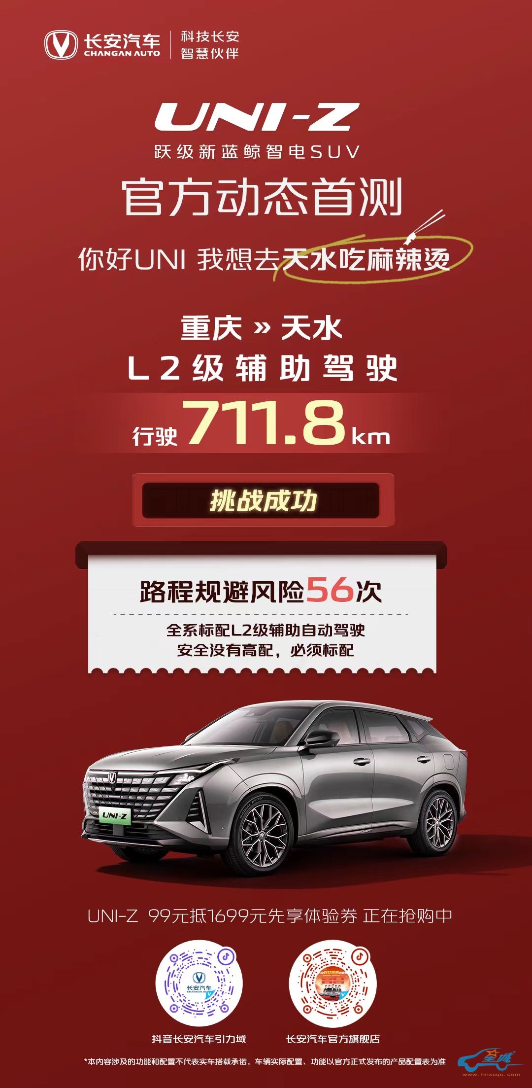 此次挑战是长安UIN-Z的官方首测,全程711.8km,途径户外、高速、城市等不同路段,媒体及达人对长安UNI-Z的产品力进行了全场景测试。作为跃级新蓝鲸智电SUV,长安UNI-Z全系标配L2级辅助驾驶系统,全程规避风险56次。与此同时,长安UNI-Z更以出色的续航、超低油耗和智驾体验,印证了其“经济高效,电感舒适”产品实力。相信长安UNI-Z必将满足用户对安全出行、便捷出行、智慧出行的美好期待。