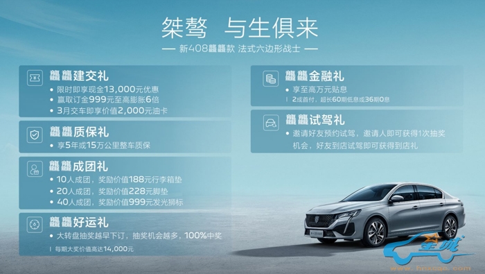 新408龘龘款上市共为客户提供龘龘建交礼、龘龘金融礼、龘龘质保礼、龘龘试驾礼、龘龘成团礼、龘龘好运礼六大豪华礼遇。