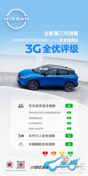 3月18日,中国保险汽车安全指数(简称:C-IASI)发布新一期参评车型的安全性测试结果,东风日产全新第三代逍客在车内乘员安全指数、车外行人安全指数、车辆辅助安全指数三个方面赢得最高“G”优秀评价,以领先同级的全优实力,为用户带来360°全方位安全守护。