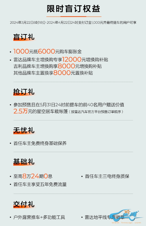 本次预售,雷达地平线为用户提供了盲订礼、抢订礼、无忧礼、基础礼、交付礼共五大权益,用户可通过雷达汽车官网、雷达汽车APP、雷达汽车微信小程序等渠道下单。其中,盲订礼包括1000元抵6000元购车膨胀金、雷达品牌车主增换购专享12000元增换购补贴等,并提供至高8万24期0息,首任车主还可享有免费终身基础保养、三电终身质保、五年免费流量等权益。此外,参加预售且在5月31日24时前提车的前40名用户赠送价值2.5万元的星空居帐篷(按雷达汽车官方平台预售订单顺序)。
