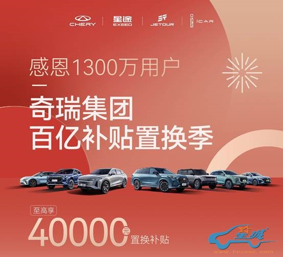 奇瑞集团百亿补贴置换季火热来袭。为响应国家“以旧换新”政策号召,奇瑞集团旗下四大品牌奇瑞、星途、捷途、iCAR联合官宣百亿补贴置换政策,感恩1300万用户的信赖与支持。