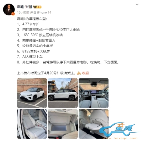 4月8日,哪吒汽车首席执行官张勇在其微博账号正式发布了增程版哪吒L的部分参数以及外观内容,并在推文最后公布称哪吒L汽车将于4月20日上市。