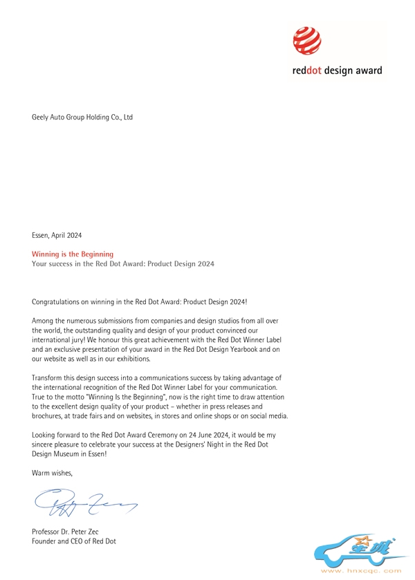 正如红点奖一直致力于追求“促进环境和人类和谐的设计”,此次,吉利银河E8斩获“2024年红点产品设计大奖”,不仅展现了吉利在设计和智能科技上的卓越实力,也表示吉利“对环境和用户负责的好设计”得到了国际权威设计机构的认可。未来,吉利设计将始终秉持「很中华、不传统、更快乐」的设计理念,以“中国设计,全球审美”持续为用户提供高价值的出行体验。