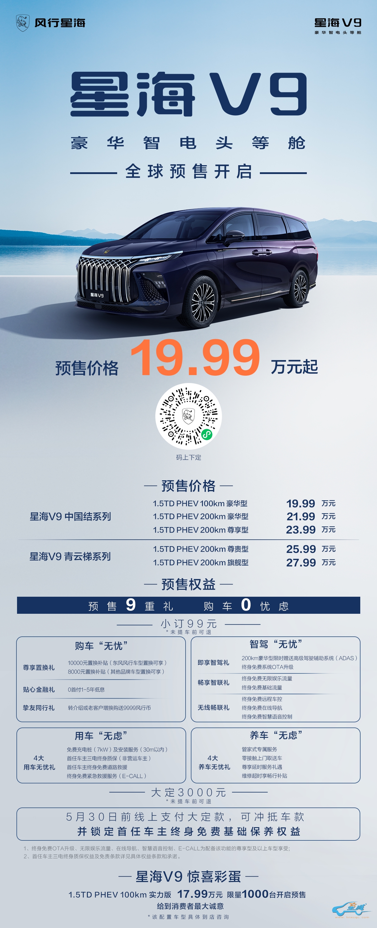 东风风行推出的星海V9车型为期待的车主们准备了一份豪华的“预售九重礼”。客户在预售期间只需支付99元的定金,便能享有一系列独家优惠。这些包括专为东风风行品牌老车主定制的高达10,000元的置换补贴(其他品牌车辆也可享受8,000元补贴)的尊享置换礼,以及提供0首付和1-5年低息金融方案的贴心金融礼。还有挚友同行礼、即享智驾礼、畅享智联礼和无线畅联礼等多重购车福利,确保消费者能轻松购车、智慧驾驶、舒适用车,并无忧养护。 此外,任何在5月30日之前在线支付3,000元定金的客户,不仅可以抵扣车款,还能锁定首任车主终身免费的基础保养服务,进一步提升了购车后的优质体验和服务保障。 作为额外惊喜,东风风行还推出了限量1000台的1.5TD PHEV实力版车型,该版本拥有100公里的纯电续航能力,并以17.99万元的诱人预售价出售,充分展现了对消费者的尊重和诚意。有关这款车型的更多详情和配置信息,请咨询就近的东风风行经销商。