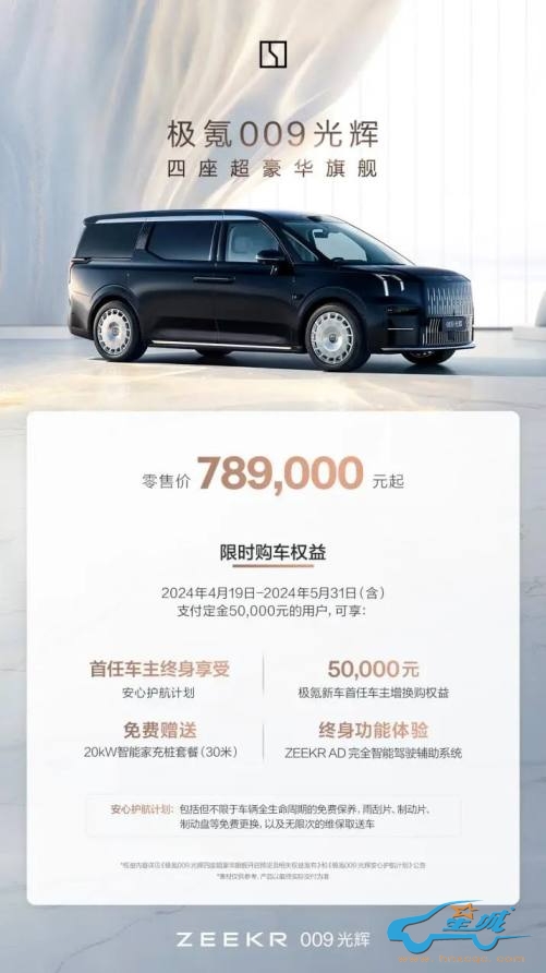 从2024年4月19日开始直至2024年5月31日止,预定极氪009光辉车型的首位自用车主若在此期间支付50,000元定金,将获得「安心护航计划」的终生权益。该计划涵盖车辆整个使用周期内的免费维护服务,包括雨刷、刹车片及刹车盘的免费更换,以及无限次数的保养上门接送服务(具体条款请参见相关公告)。此外,首位极氪车辆的购买者(限已交车的顾客),若在2024年5月31日前(含当日)购置首辆极氪009光辉,将得到50,000元的购车尾款优惠。同时,所有极氪009光辉车型的车主也将享有一套20kW的智慧家居充电桩组合(电缆长度为30米),并有资格免费升级至ZEEKR AD全智能驾驶辅助系统的终身使用权(详细内容可参考极氪009光辉上市公告)。