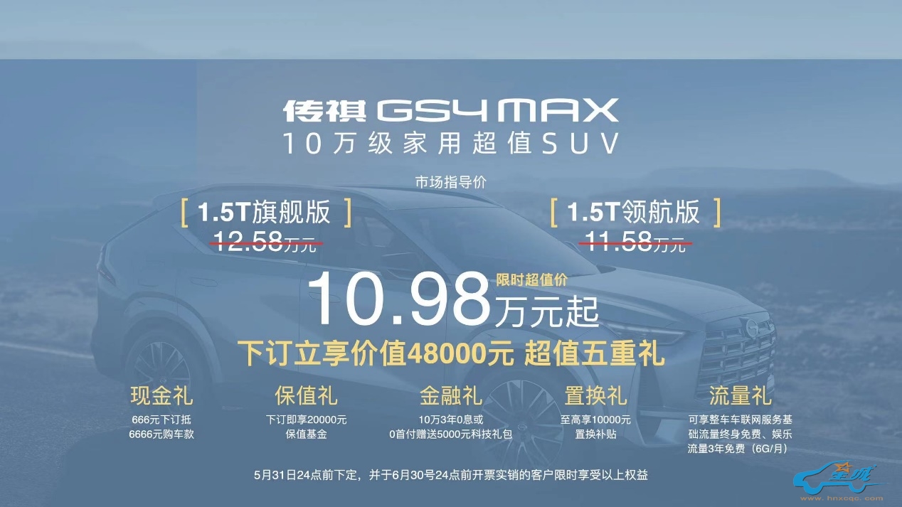 2024年4月18日,全新的传祺GS4 MAX车型正式推出市场,以吸引的特惠价格10.98万元至11.98万元亮相。为庆祝其上市,该车系还特别提供了一系列购车优惠,包括价值2万元的保值基金计划、无限期的基础数据流量和一项3年内零利率的10万元贷款方案。