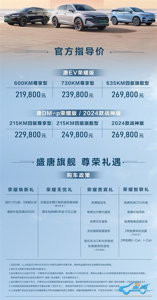 4月22日消息,比亚迪公司推出了其中型SUV系列的特别荣耀版车型,其中包括唐EV荣耀版和唐DM-p荣耀版以及2024款的唐DM-p战神版。这一系列共计六种不同配置的车型正式开售,价格区间设置在21.98至26.98万元人民币之间。为了庆祝新款上市,官方还提供了多种优惠礼遇,包括荣耀换新礼、荣耀无忧礼、荣耀贵宾礼和荣耀智联礼,具体信息可参考下方图片。