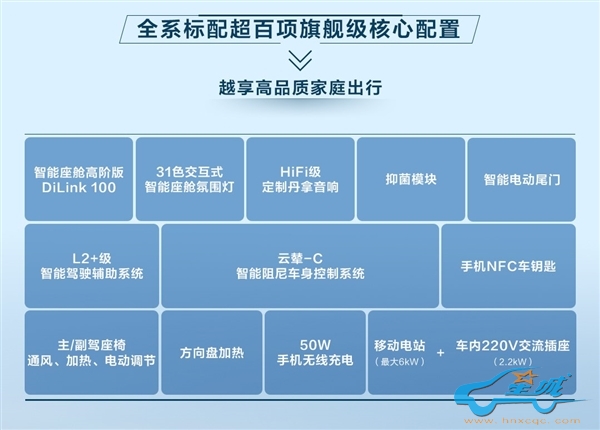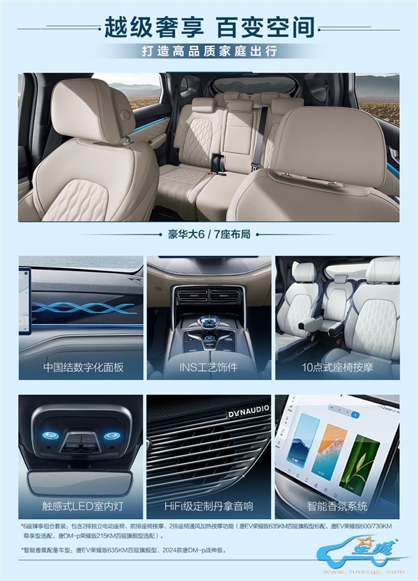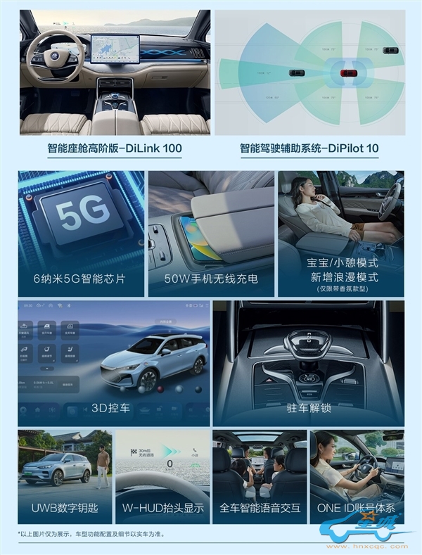这款车辆经历了一系列豪华升级,配备了10点按摩功能的座椅以提升舒适体验,一个智能香氛系统营造宜人车内氛围,高级定制版的丹拿音响确保音质纯净,以及可调节的LED阅读灯满足个性化照明需求。此外,车辆内置了6纳米工艺的5G智能芯片,为车载系统带来更快速的数据处理能力。还提供了50W的手机无线充电功能,让驾驶者保持设备充满电。3D控车技术、自动驻车解锁、UWB数字钥匙等智能科技提升了操控的便利性,而W-HUD抬头显示和全车语音交互功能则增强了驾驶的安全性和互动性。