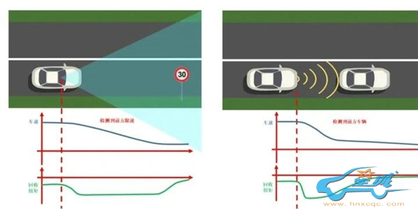 预测性能量管理技术为新能源汽车带来了三项关键创新功能,分别是智能能量回收、主动发动机操控和高效高压电池调节。这些技术从三个核心方面出发,有效地缓解了新能源车主在日常行驶中所面临的主要问题。 智能能量回收技术,在特定场景下如与前车保持较近距离、速度超越前车时,或是面对交通圆形交叉口和限速标识时,会启动并增强电能的回收效率。系统自动调整,将多余的动力能转换为电池储能,最大化能量回充效率,确保安全的同时减少对驾驶者“黄金右脚”依赖,从而有效减缓用户关于续航和燃油消耗的担忧,推动更加环保的出行方式。