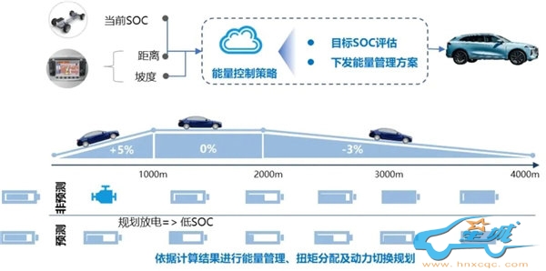 预测性高压电量管理技术是节能领域的佼佼者,它通过分析驾驶者设定的终点,综合考量车辆的能量耗费以制定最优的动力策略。该技术精确计算内燃机与电动机之间的最佳扭矩分配,确保在不牺牲驾驶性能的前提下,尽可能地让内燃机在其最效率的状态下运行。这样不仅大幅减少发动机排放,降低汽车的碳排放量,同时也考虑到了经济性方面的使用成本。 此外,预测性高压电量管理技术还能够进行全局能量规划,根据用户设定的目的地和目标剩余电量,调整能量使用策略。它确保用户能够根据自己的需求设置期望的剩余电量值,并在达到该目标的基础上进一步实现节能效果。这种智能化的管理方式,既满足了用户的个性化需求,也提升了能源的使用效率。