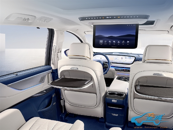 在内饰设计上,这款新车型装备了一个横跨整个中控台的曲面大屏,并且后座配备了顶部娱乐屏,为第二排乘客提供了便利的小桌板。