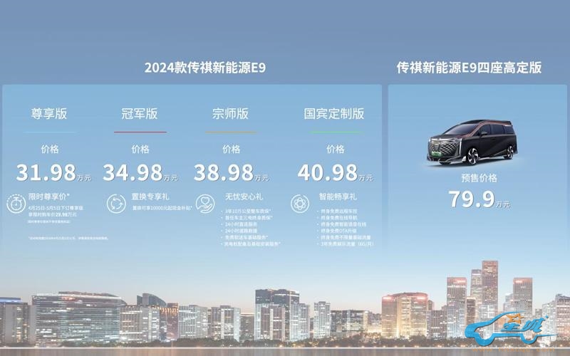 在最新的产品发布会上,被誉为“中国MPV专家”的广汽传祺公司推出了他们的最新力作——2024款传祺新能源E9。这款新型豪华多功能乘用车(MPV)在奢华感和驾乘舒适性上均获得了显著提升。为满足消费者对高品质新能源豪华MPV的各类需求,新车推出了两个新的版本:售价29.98万元的尊享版(限时优惠),以及定价40.98万元的国宾定制版。 此外,广汽传祺还与世界领先的汽车改装品牌德国罗伦士合作,针对追求极致商务体验的高端客户群体,推出了定制版的传祺新能源E9四座高定版,并已经开始了该版本的预售活动。这一特别定制版本的预售价格定为79.9万元,展现了其独有的尊贵与专属定制的高端定位。