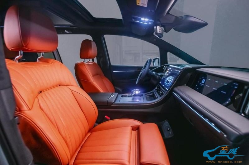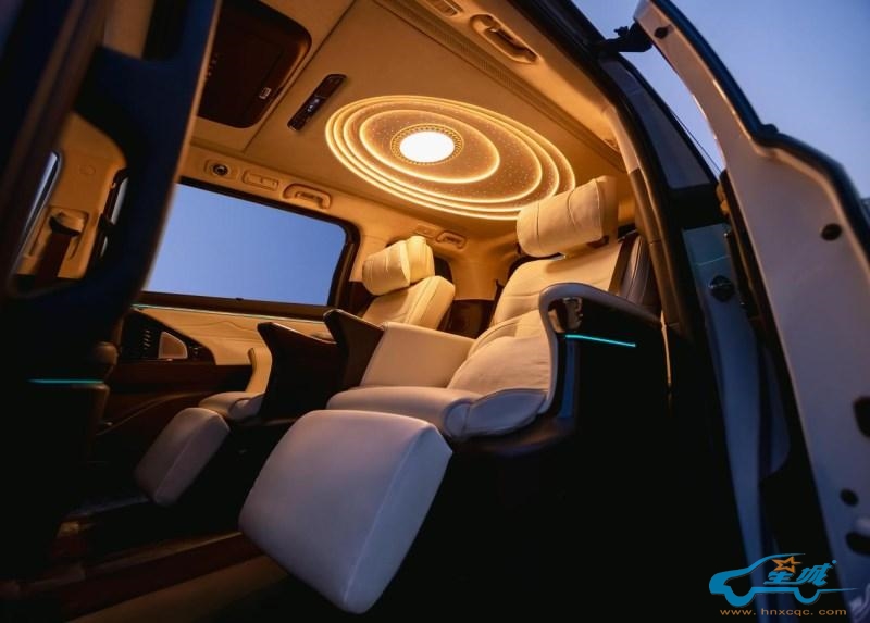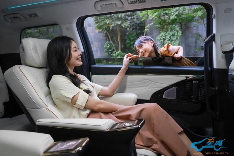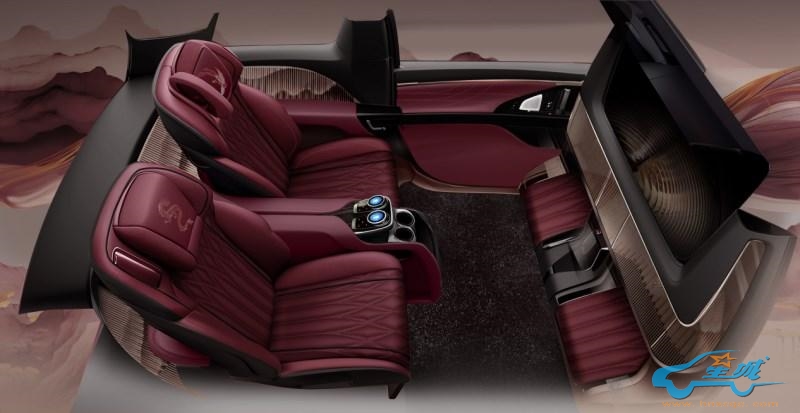 此外,车内设计精心定制,呈现出高端豪华的环绕式座舱,配备了具有14向电动调节功能的零重力座椅,为商务出行带来极致的舒适体验。座椅头枕上的“龙凤呈祥”精细刺绣以及中控台的豪华定制级扶手箱,不仅提供了华丽的视觉盛宴,也兼具了实用性。同时,32英寸的高清投影大屏幕、智能定制的电动车踏以及电动桌板,确保家庭娱乐、工作处理等多种需求都能在车内得到无缝衔接。