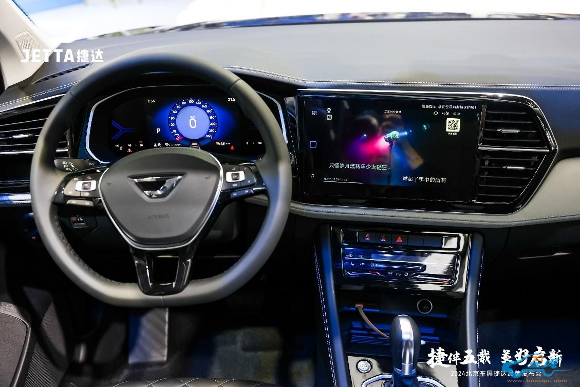 战魂铠甲的设计采用了一种尖锐且富有攻击性的进气格栅,营造出独特的前脸形象。车身两侧的风之翼同色侧裙与尾部的云之翼尾翼相辅相成,创造出一种连贯的雕琢流线效果,从车头一直延伸到车尾。这些细节在视觉上增强了车辆的宽度感,提高了视觉冲击力,同时形成了多层次的光影效果。锐利的星形日间行车灯和纤细的LED前大灯进一步强调了这种如雕塑般的力量之美。 现代而精致的“JETTA”字样取代了传统的车标,展现出更加现代和高品质的形象。新款捷达VS5引入了一种名为“闪耀蓝”的车漆,呈现出清澈透明的视觉效果,为车辆增添了一份清新感。除此之外,还有跃动蓝、极地白、星河灰、锰石黑等多种颜色可供选择,以适应不同消费者的个性化需求。