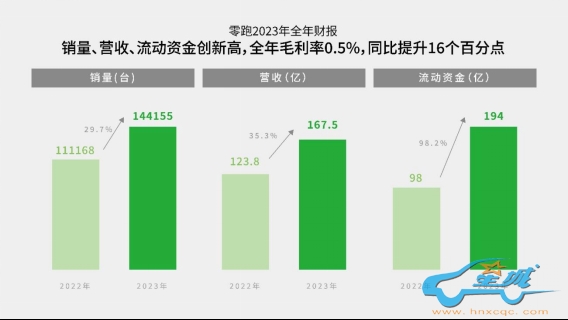 值得一提的是,零跑还交出了一份上市第二年的优异成绩单——零跑2023年财报显示,全年营收创新高达到167.5亿元,同比增长35.2%,增长幅度属新势力前列;2023年,零跑首度实现全年毛利率转正,根据行业常规,如若将给予经销商的返利加回,零跑的毛利率能达到10%左右,毛利持续改善;同时,零跑汽车经营现金流也首次全年转正,达到10.8亿元;截至2023年年底,公司在手资金资源充裕,达到193.9亿元。