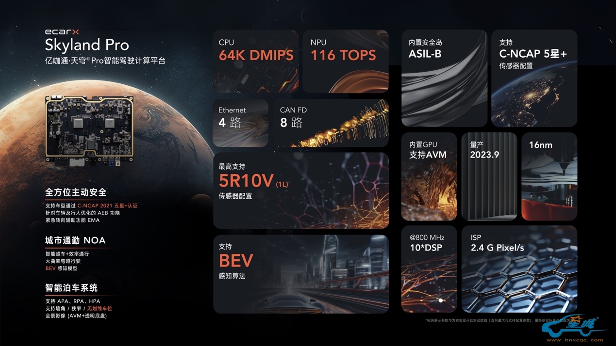 此次新增的高速NOA领航驾驶辅助功能由亿咖通·天穹®Pro智能驾驶计算平台(以下简称“该平台”)提供强大软硬件支持,该平台集成两颗黑芝麻智能华山®二号A1000芯片、10个摄像头以及5个毫米波雷达,算力高达116 TOPS (INT8),是面向主流车型L2+高阶行泊一体的高算力强视觉方案。搭配高精地图,可实现在高速公路、高架等封闭道路内,由驾驶员监督,完成自主变道超车、自主上下匝道等操作,实现地图覆盖区域内点到点的辅助驾驶。随着产品功能的不断升级,未来将实现城市NOA、HPA记忆泊车等高阶ADAS功能。