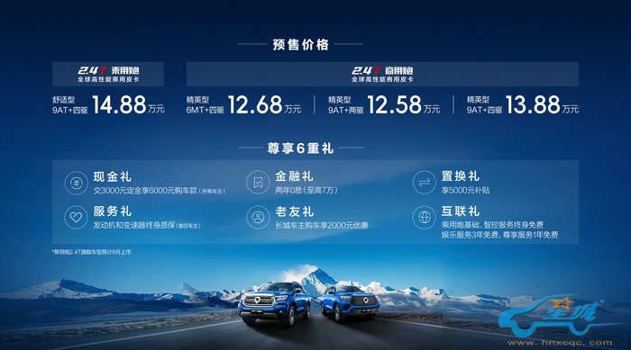 全新2.4T柴油四驱动力炮车型现已开启预售,其中乘用车款的9AT 2.4T柴油四驱版本带来特惠价人民币14.88万元。商用版本的2.4T柴油四驱炮车型同样开放预约,价格区间为12.58万元至13.88万元。为了感谢广大消费者的支持,我们特别推出六重优惠大礼,包括服务礼包、现金回扣、金融优惠、置换补贴、针对老客户的专属礼遇,以及仅限于2.4T乘用炮车型的互联科技礼包,以实实在在的优惠和诚挚的心意回报顾客,确保您购车无忧,价值感满满。