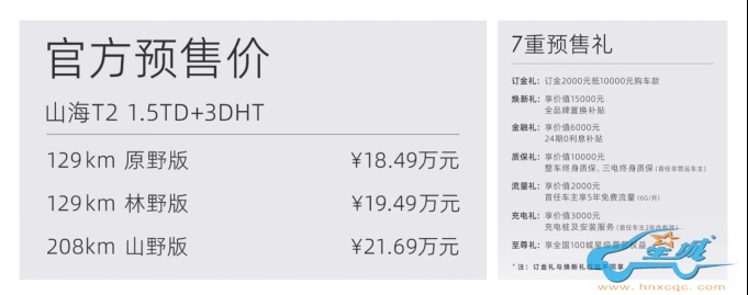 4月2日,捷途汽车宣布,定位为“旅行越野超混SUV”的山海T2正式开启预售。新车共计将推出3款不同配置车型,预售价格区间为18.49万-21.69万元。同时,预售期间捷途官方还将为用户推出7重预售礼。