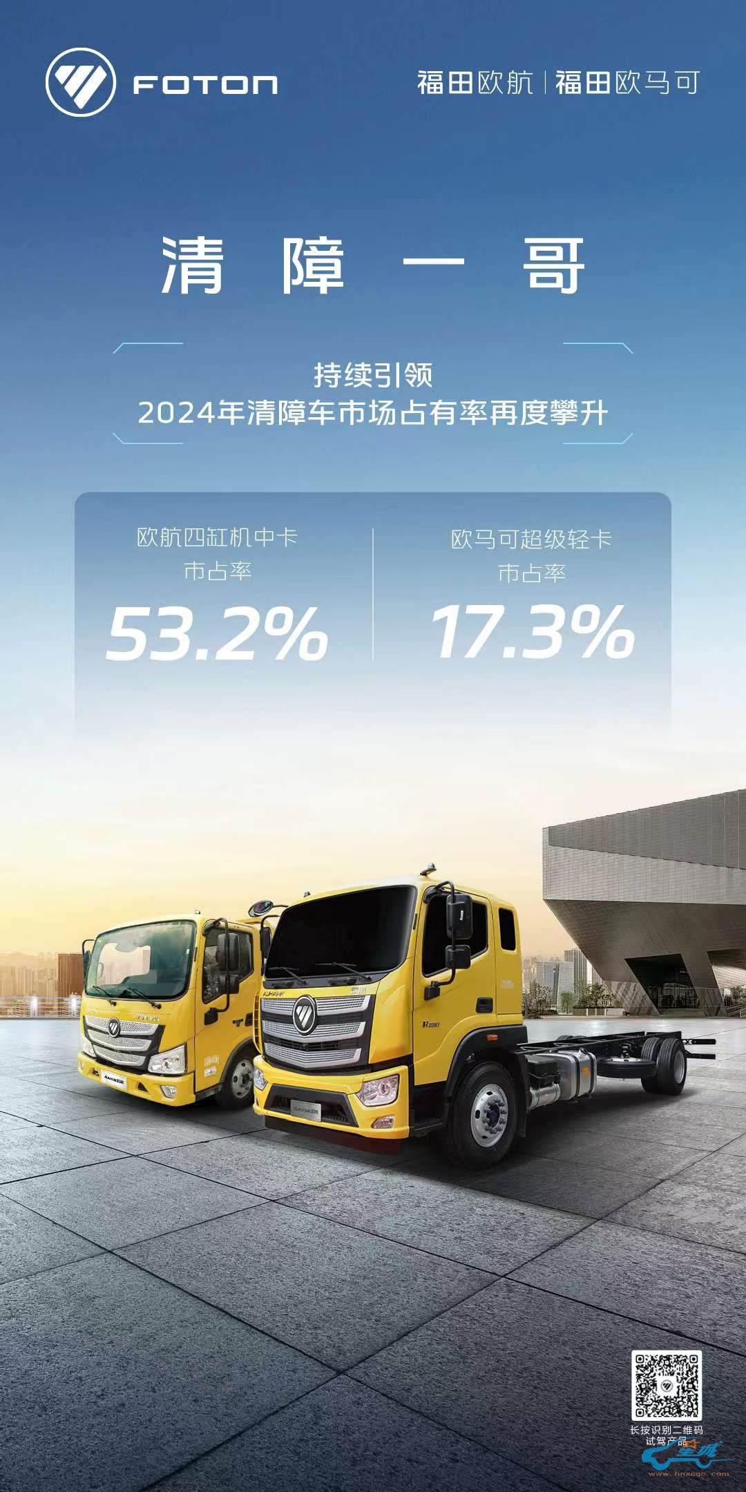 深度定制的产品解决方案、卓越的性能表现为欧航欧马可专用车业务市场占有率的提升奠定了坚实的基础。数据显示,一季度欧航中卡清障车行业占有率达53.18%,欧马可清障车行业占有率达17.32%。欧马可冷藏车占有率达20.4%,欧马可环卫车占有率同比提升一倍。