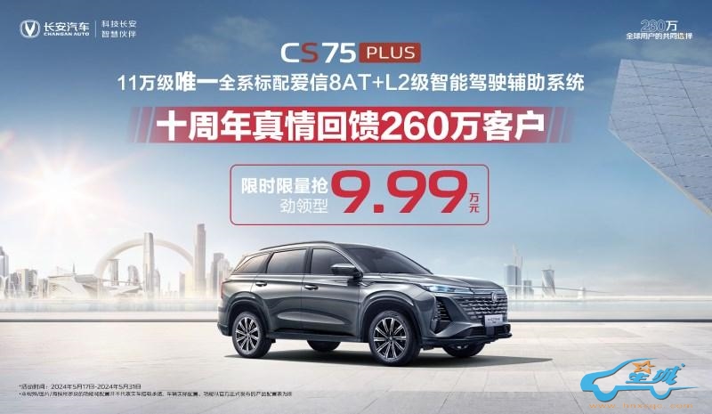 十周年真情回馈,钜惠来袭,不容错过!时值CS75车型上市十周年里程碑节点,即日起至5月31日,长安汽车推出9.99万元限时、限量抢第三代CS75 PLUS冠军版劲领型活动,真情回馈260万客户。