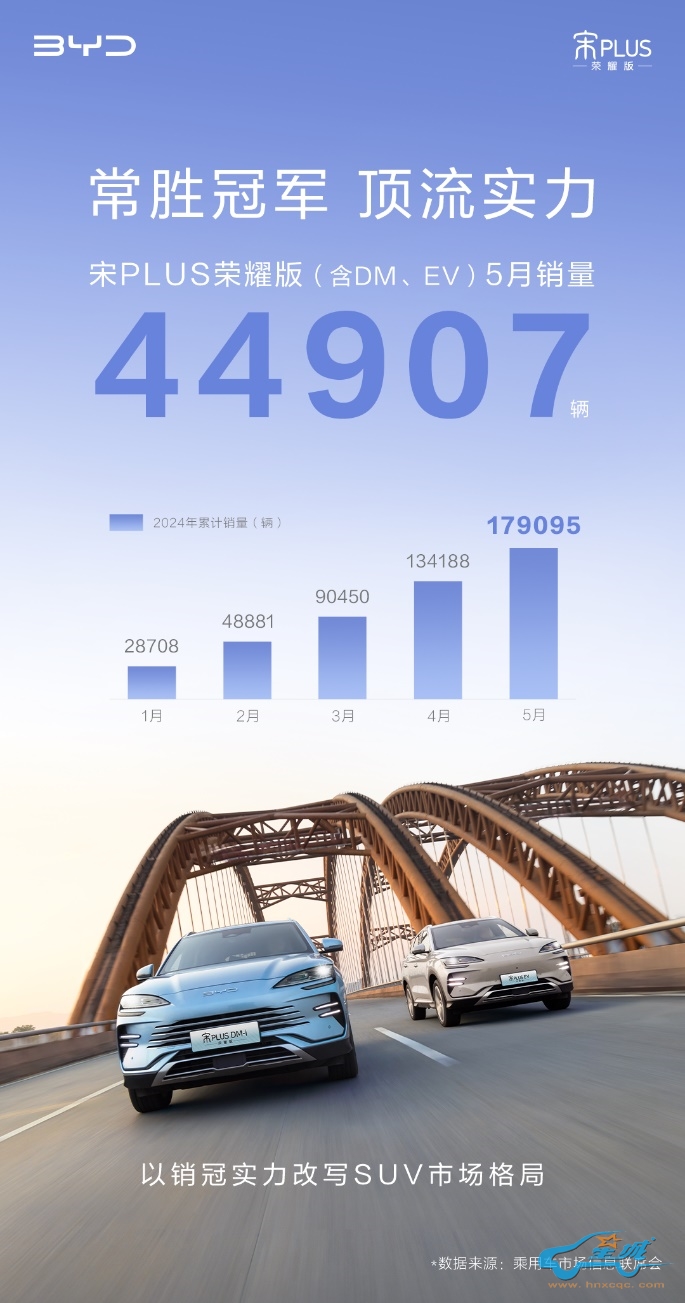 与此同时,比亚迪始终坚持纯电动和插电混动“两条腿,齐步走”的战略。在宋PLUS DM-i持续展现耀眼热销表现的同时,宋PLUS EV也成为15-20万级主流SUV市场中唯一一款销量过万车型,5月份销量达到12822辆,且销量持续稳居万台之上,成为纯电车破局主流家用SUV市场的成功典范。DM-i车型、EV车型携手向上,让宋PLUS成为中国主流SUV市场中第一个完成新能源替代传统燃油的车型。