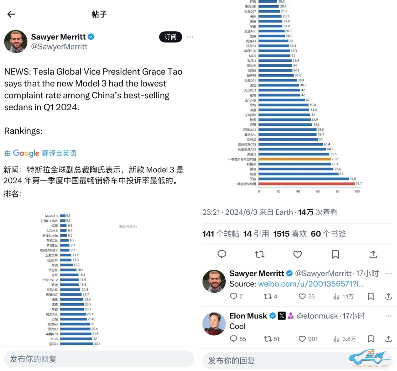 以Model 3为例,有媒体根据单周上险量预估,Model 3 在5月份的销售量已超过15000台。在销量猛增的背后,是Model 3 安全可靠的产品力。在车质网发布的第一季度热销轿车投诉率排名中,Model 3在上百款车型中脱颖而出成为投诉里最低的车型,投诉率仅为行业平均值的5%。特斯拉超越传统豪华品牌BBA的品质表现,让这个排名在海外社交媒体也得到了广泛关注,马斯克评价这一成绩“很酷”。