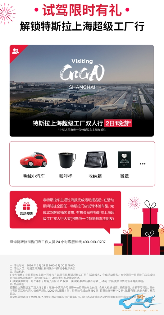 除了上述的金融方案外,特斯拉再度加码,以非凡的诚意为广大消费者带来了全新的重磅福利!上海超级工厂两日一晚游,甚至可以去美国弗里蒙特工厂参观游览!全国非特斯拉车主只需通过海报完成活动报名,即可前往全国任一特斯拉门店试驾体验。试驾结束后,您将解锁抽奖资格,有机会赢取特斯拉上海超级工厂2日1晚双人行大奖。