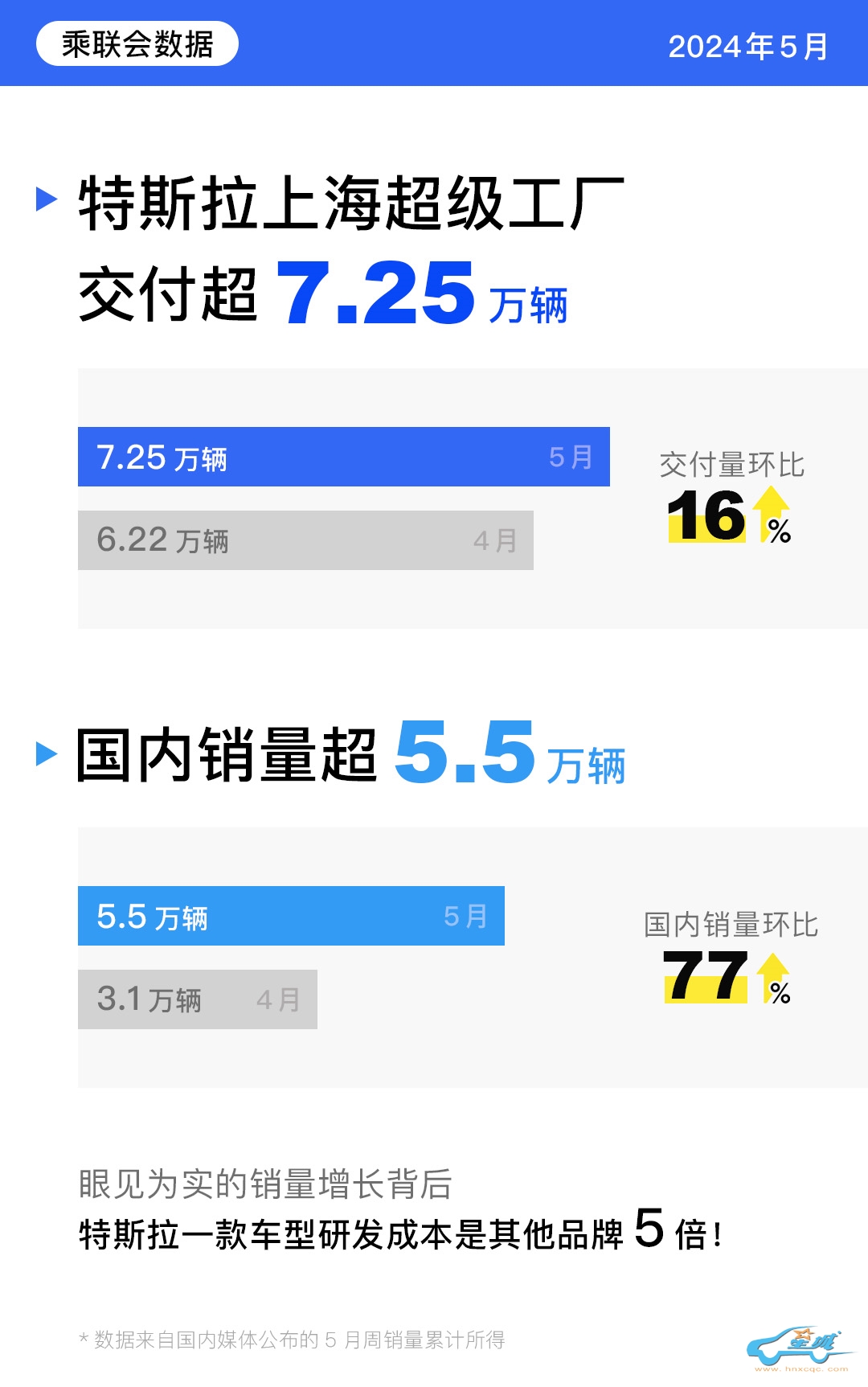 近日,根据乘联会发布最新数据,特斯拉上海超级工厂在5月份交付了72,573辆电动车,其中,据媒体统计,特斯拉5月国内销量已超过5.5万辆,环比逆势暴涨77%,同比增长30%。