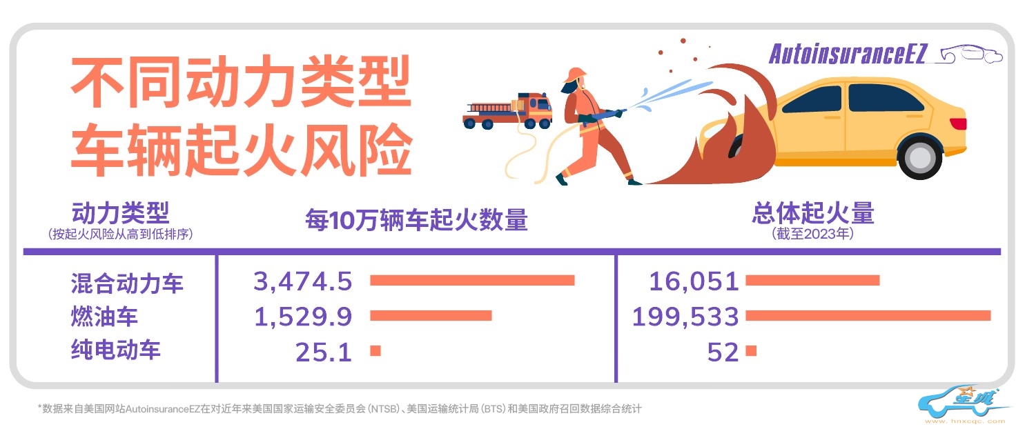 美国汽车保险工具网站AutoInsuranceEZ统计发现,混合动力汽车引发的汽车火灾比例最高,其次是汽油车,最少的是电动车。每 10 万辆电动车仅发生 25 起火灾,而每10万辆混动汽车发生3474.5起火灾。混动汽车发生火灾的比例是电动车的近140倍,是燃油车的2.3倍。