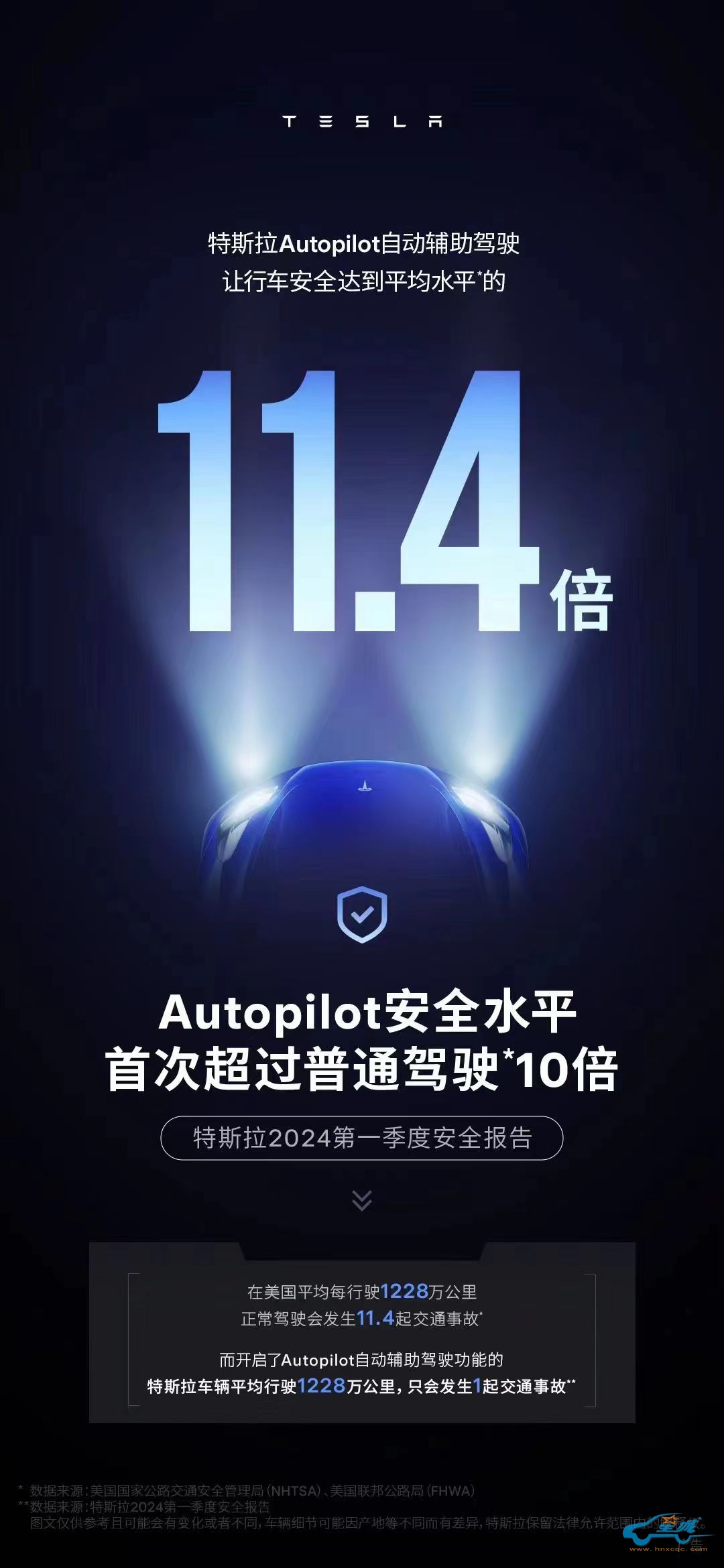 在安全性方面,特斯拉做了大量工作。特斯拉基于纯视觉方案的智能驾驶技术显著提升了驾驶安全,据特斯拉2024年第一季度安全报告显示,开启了Autopilot的特斯拉车辆,行车安全达到了平均水平的11.4倍。
