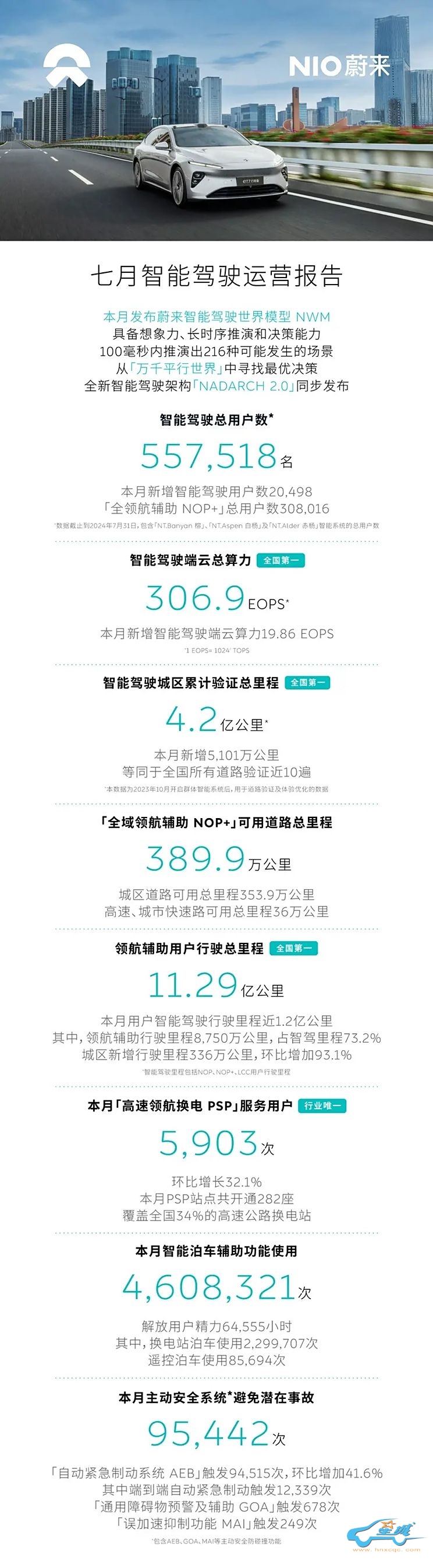 8月4日,蔚来发布7月份智能驾驶运营报告。数据显示,蔚来新增智能驾驶用户20498名,总用户数达557518名。其中,全域领航辅助NOP+用户数达308016名。智能驾驶端云算力新增19.86 EOPS,总算力达306.9 EOPS。