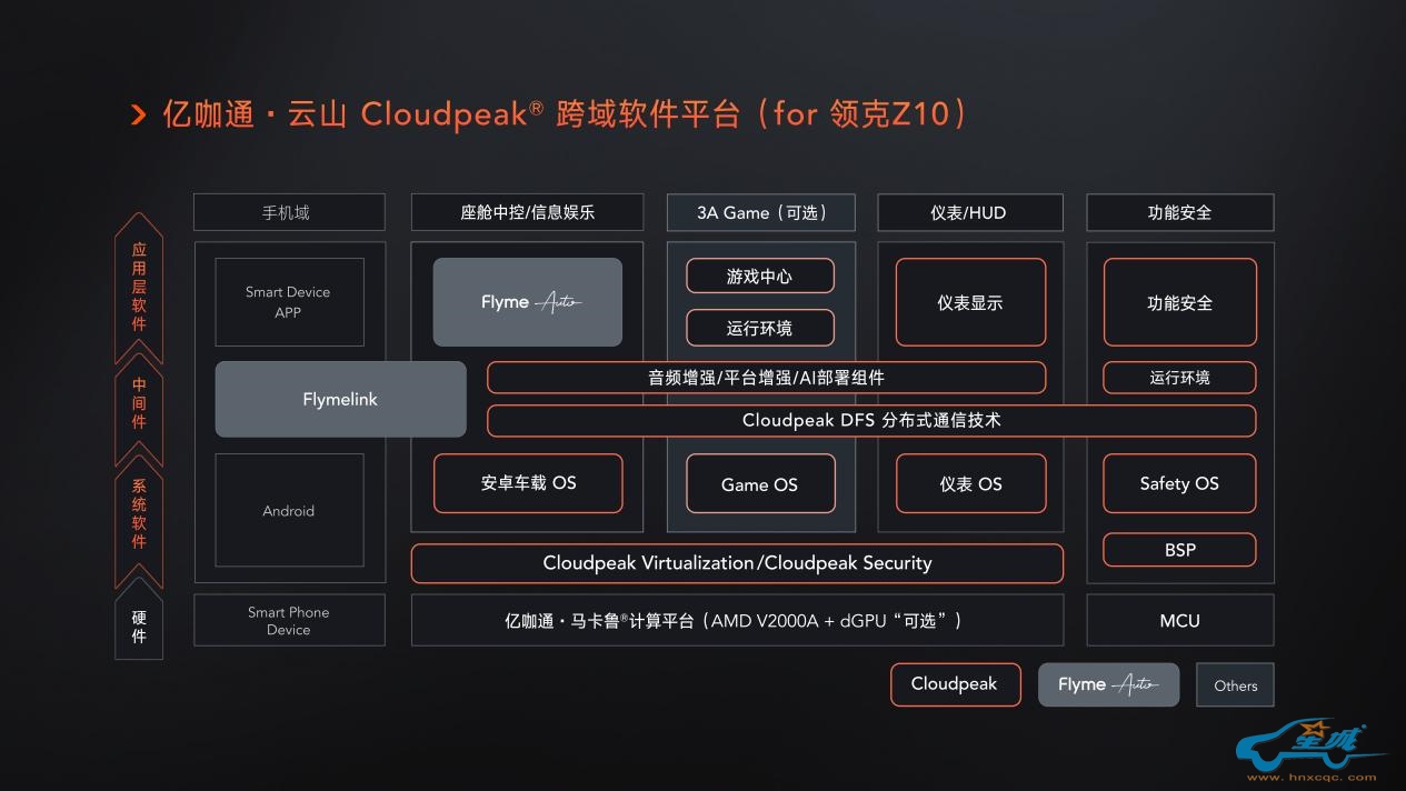 为满足马卡鲁平台搭载领克Z10,云山跨域软件平台充分考虑桌面级架构的特性,自研开发了更高效、更安全的Cloudpeak Virtualization、专属优化的Android-Automotive OS、仪表OS、Safety OS与功能模块,全面支撑领克、亿咖通科技、星纪魅族联合打造的全新LYNK Flyme Auto操作系统,与SEA浩瀚架构协同,打通智舱、智驾及车控域,实现全场景HUD、3D人机共驾等功能创新,指引未来智舱智驾融合发展。