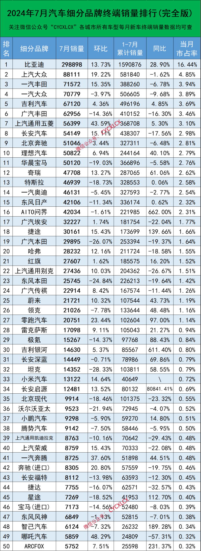 在7月份的品牌销售排行中,比亚迪以13.73%的环比增长和月销量达到29.98万辆,继续稳坐榜首位置。上汽大众的销售业绩也有所上升,月销量增至8.81万辆,实现了19.22%的增长,使其成为前十名中的亚军,仅次于上汽通用五菱。一汽丰田也展现出显著的增长,其排名从第六跃升至第三位,月销量为7.15万辆。