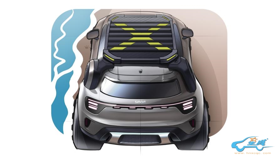 与整车设计相呼应,便捷进出侧踏板采用了高品质的半哑光金属,并使用错落有致的胶囊圆防滑垫加以点缀,不仅具备防滑耐磨等特性,更从视觉上进一步提升了车辆的硬派气质。设计优雅的贴心小书包安装在车身左侧的D柱,不仅体现了 smart 的时尚美学和匠心巧思,更将成为户外装备的理想收纳之处,确保奇旅之上的必需配备始终触手可及。通向车顶的自由侧爬梯位于车辆右侧的D柱,可折叠伸缩的设计节省了空间。在造型方面,无论贴心小书包还是自由侧爬梯都在方正棱角与圆润灵动中找到巧妙平衡,与smart家族的设计语言相呼应,质感拉满。同时,底盘安全装甲也将为车辆提供更周全保护。