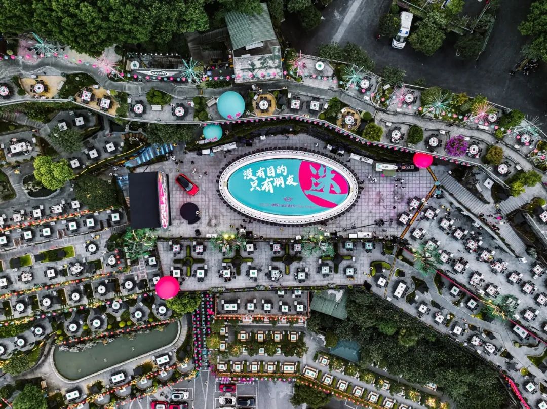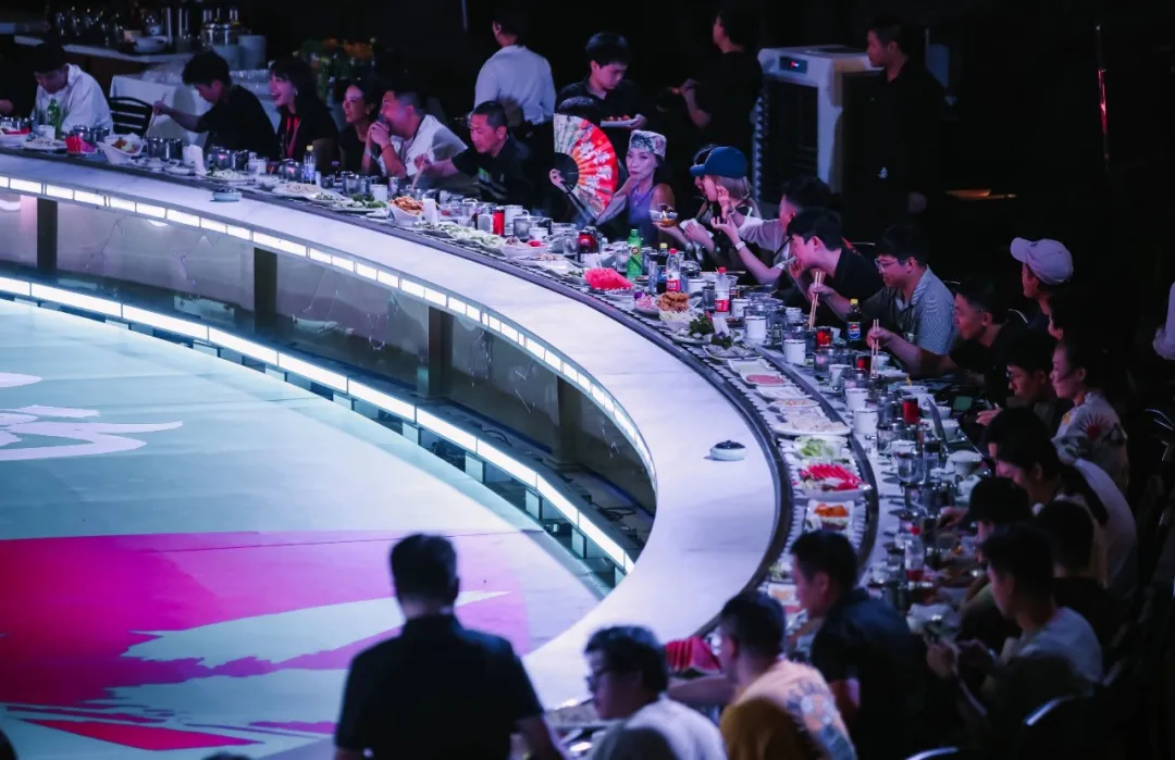 要说现场最大的亮点,那一定是主舞台区域的一张超大圆桌,可以容纳80人就餐。而在大圆桌的内圈里装饰着此次发布会主题“没有目的,只有朋友”,俯视下去,相当壮观,妥妥的川渝“坝坝席”既视感。